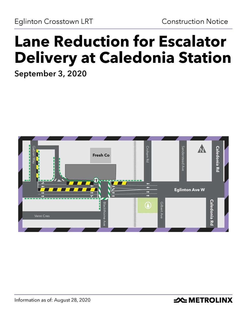 On Thursday September 3, a large escalator delivery will take place at Caledonia station. During this activity, westbound Eglinton Ave W will be reduced to one (1) lane only between Blackthorne Ave and Gabian Way. Lane reductions will begin as early as 6:00am and last for approximately 12 hours.