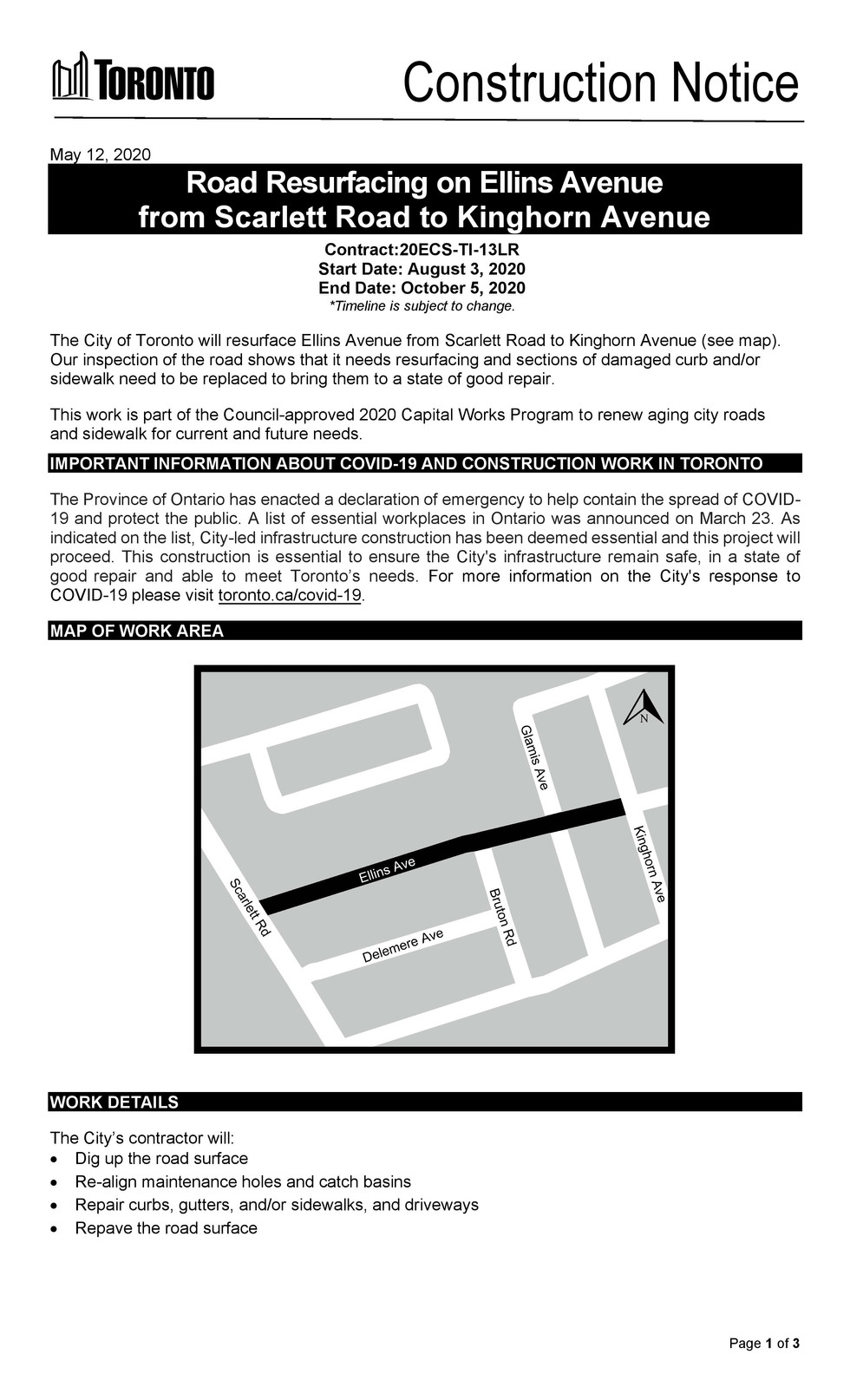 The City of Toronto will resurface Ellins Avenue from Scarlett Road to Kinghorn Avenue (see map). Our inspection of the road shows that it needs resurfacing and sections of damaged curb and/or sidewalk need to be replaced to bring them to a state of good repair. This work is part of the Council-approved 2020 Capital Works Program to renew aging city roads and sidewalk for current and future needs.