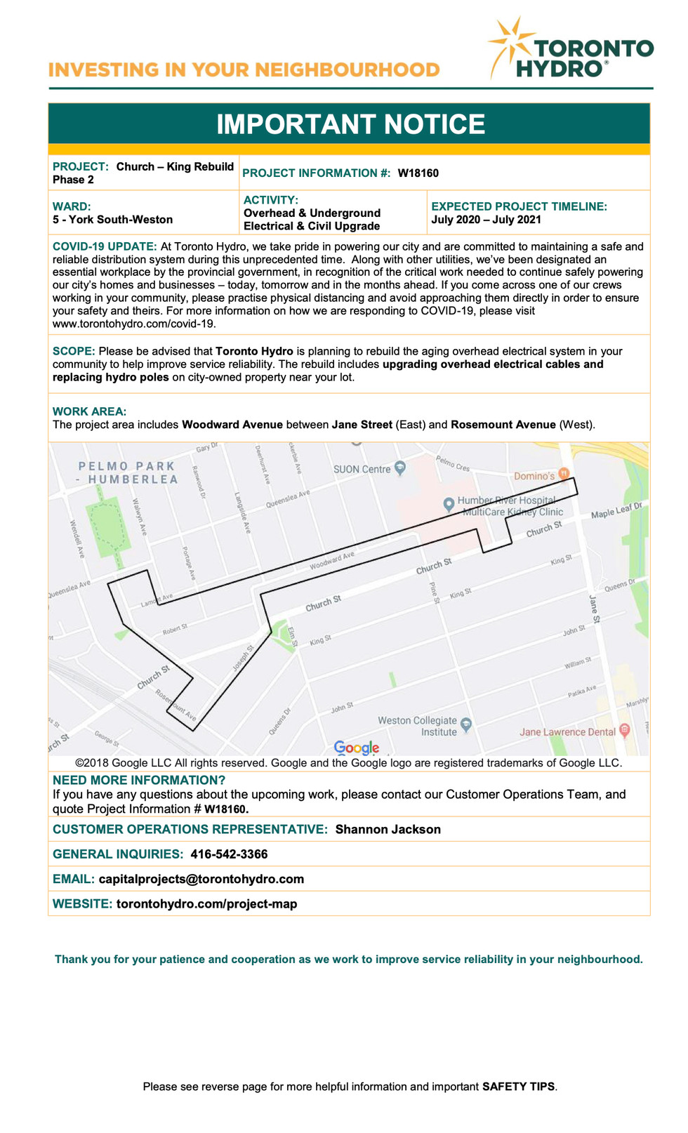 GENERAL INQUIRIES: 416-542-3366 EMAIL: capitalprojects@torontohydro.com WEBSITE: torontohydro.com/project-map Thank you for your patience and cooperation as we work to improve service reliability in your neighbourhood. SAFETY TIPS.