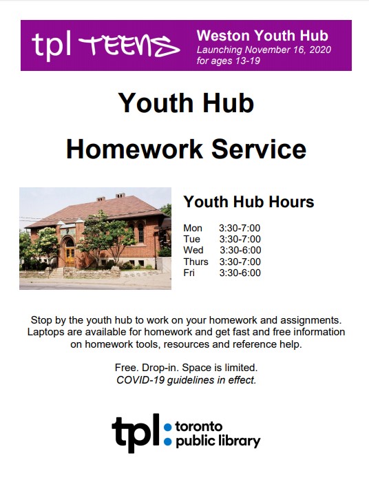 Stop by the youth hub to work on your homework and assignments. Laptops are available for homework and get fast and free information on homework tools, resources, and reference help.
